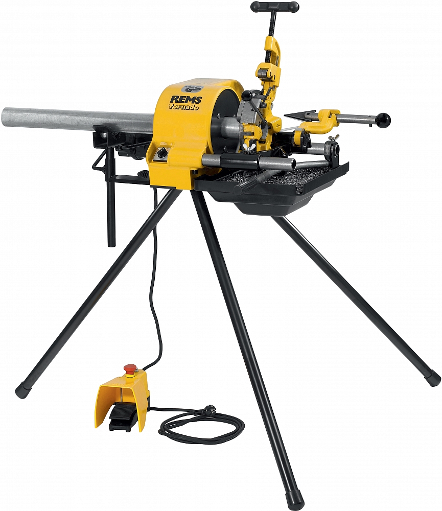 - Rems Торнадо. Станок для нарезания трубной резьбы (1/16") 1/8" – 2", 16 – 63 мм, болтовой резьбы (6) 10 – 60 мм, 1/4" – 2". Не требующий технического обслуживания редуктор, педаль включения с защитой, 2 автоматических зажимных патрона, автоматическое охлаждение и смазка. С комплектом инструмента, состоящим из универсальной автоматической резьбонарезной головы для всех видов,в том числе длинной резьбы, автоматически открывающейся после нарезания заданной конической резьбы, гребенок для конической трубной резьбы ISO 7-1, EN 10226 (DIN 2999, BSPT) R 1/2" – 3/4" и R 1" – 2" правая, трубореза, гратоснимателя. 3 двигателя на выбор. Переносной вариант на трех ножках, со снимающейся большой масляной ванной и поддоном для стружки. Вариант Т со встроенной увеличенной масляной ванной и поддоном для стружки для размещения на верстаке, стойке или передвижной тележке с подставкой для труб. В коробке.