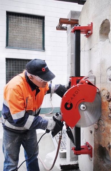 Ручная электрическая алмазная дисковая пила Cardi PE 400 (Карди ПЕ 400) – стенорезная машина для мокрой резки дверных и оконных проемов; стен и перекрытий: кирпичных, каменных, бетонных, железобетонных; бетонных труб; дорожных плит; нарезки швов на глубину до 160 мм.
