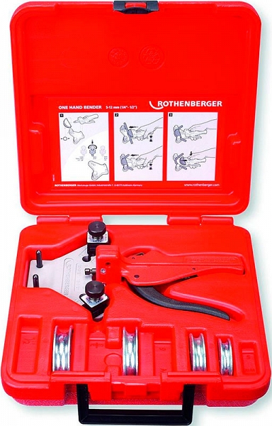 Ручной арбалетный трубогиб Rothenberger Tube Bender Set 1/4"-5/16"-3/8"-1/2" (Ротенбергер Тюб Бендер Сет 1/4"-5/16"-3/8"-1/2") предназначен для быстрой и точной гибки до 90° мягких медных труб, алюминиевых труб, мягких медных труб в оболочке, мягких тонкостенных стальных труб Ø 1/4", 5/16", 3/8", 1/2" при монтаже систем вентиляции, кондиционирования, водоснабжения, пневматических и гидравлических систем, в автомобилестроении и холодильной технике.
