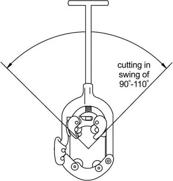 - Благодаря 4-м режущим роликам рез осуществляется в 4-х местах: труборез достаточно поворачивать всего на 90° вокруг оси заготовки – минимальное вращение (90° – 110°) необходимо для узких мест