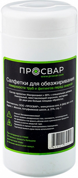 Салфетки для обезжиривания поверхности труб и фитингов перед сваркой Просвар 50 шт. (Prosvar 50 шт.) предназначены для обезжиривания поверхности полипропиленовых (пп), полиэтиленовых (пэ, пнд) и других пластиковых труб и фитингов перед раструбной муфтовой и электромуфтовой сваркой, для удаления загрязнений, которые снижают прочность стыка.