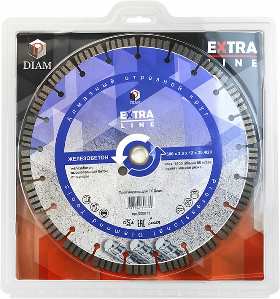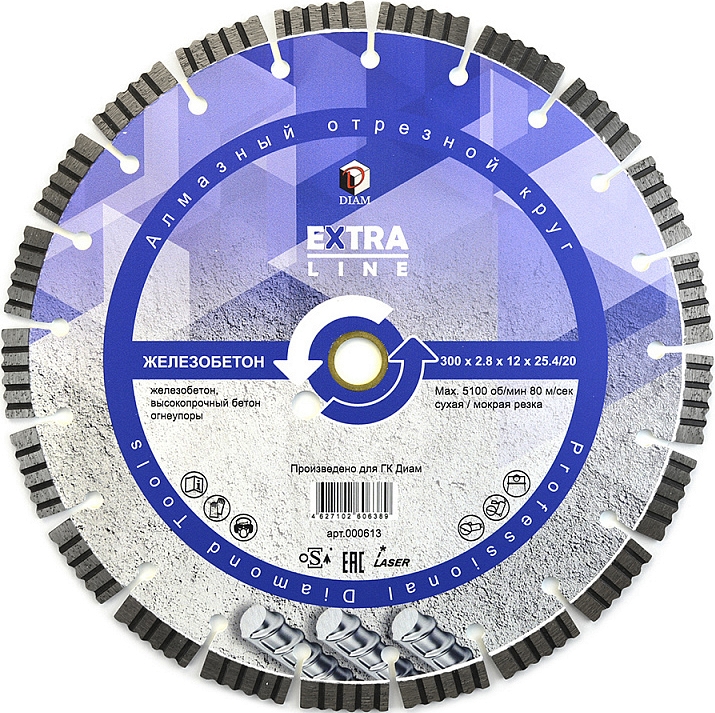 Сегментный алмазный круг Diam Extra Line 1A1RSS Turbo Железобетон 300 мм (Диам Экстра Лайн 1А1РСС Турбо Железобетон 300 мм) – профессиональный алмазный отрезной диск с лазерной сваркой сегментов для сухой и мокрой резки железобетона, старого высокопрочного бетона, клинкера, огнеупоров и других твердых материалов на бензорезах, электрических резчиках и плиткорезах, камнерезных станках, стенорезных машинах, швонарезчиках, как с водяным охлаждением, так и без.