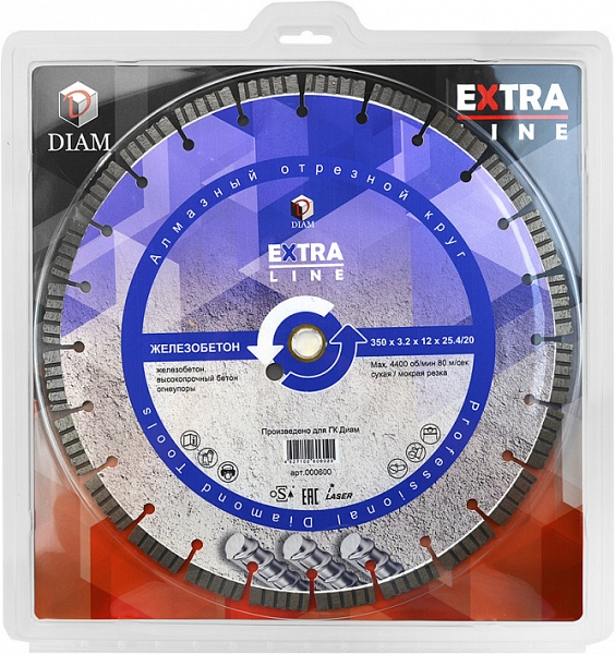Сегментный алмазный круг Diam Extra Line 1A1RSS Turbo Железобетон 350 мм (Диам Экстра Лайн 1А1РСС Турбо Железобетон 350 мм) – профессиональный алмазный отрезной диск с лазерной сваркой сегментов для сухой и мокрой резки железобетона, старого высокопрочного бетона, клинкера, огнеупоров и других твердых материалов на бензорезах, электрических резчиках, камнерезных станках, стенорезных машинах, швонарезчиках, как с водяным охлаждением, так и без.