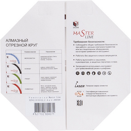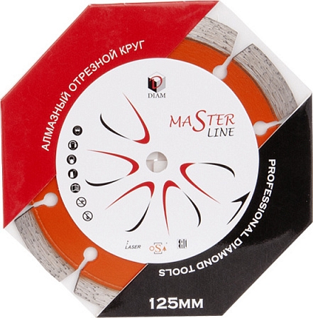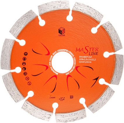 Сегментный алмазный круг Diam Master Line 1A1RSS Универсал 125 мм (Диам Мастер Лайн 1А1РСС Универсал 125 мм) – специальный алмазный отрезной диск с лазерной сваркой сегментов для сухой и мокрой резки бетона, тротуарной плитки, кирпича, черепицы, песчаника, природного и искусственного камня, строительных материалов общего назначения на углошлифовальных машинах (ушм, болгарках), штроборезах, системах резки крупноформатной плитки, с подачей и без подачи воды.