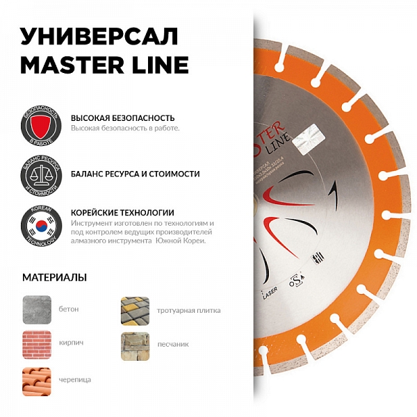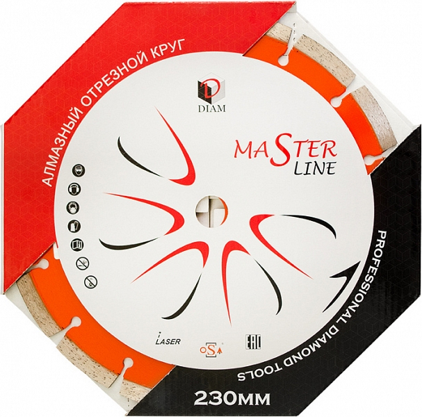 Сегментный алмазный круг Diam Master Line 1A1RSS Универсал 230 мм (Диам Мастер Лайн 1А1РСС Универсал 230 мм) – специальный алмазный отрезной диск с лазерной сваркой сегментов для сухой и мокрой резки бетона, тротуарной плитки, кирпича, черепицы, песчаника, природного и искусственного камня, строительных материалов общего назначения на углошлифовальных машинах (ушм, болгарках), штроборезах, системах резки крупноформатной плитки, бензорезах, электрических резчиках и плиткорезах, ручных стенорезных машинах, с подачей и без подачи воды.
