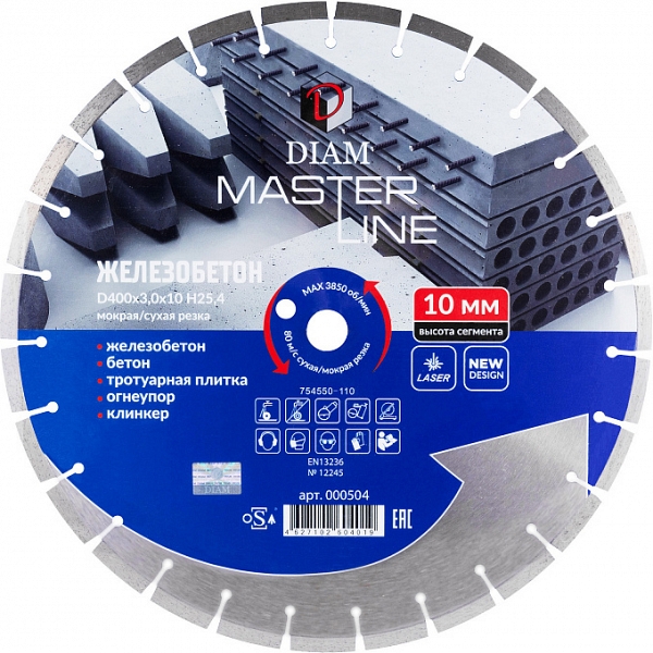 Сегментный алмазный круг Diam Master Line 1A1RSS Железобетон 400 мм (Диам Мастер Лайн 1А1РСС Железобетон 400 мм) – профессиональный алмазный отрезной диск для сухой и мокрой резки бетона, армированного бетона (железобетона), тротуарной плитки, кирпича, клинкера, огнеупоров и других строительных материалов, схожих по характеристикам, на бензорезах, электрических резчиках, камнерезных станках, стенорезных машинах, швонарезчиках и другом оборудовании, с подачей и без подачи воды.