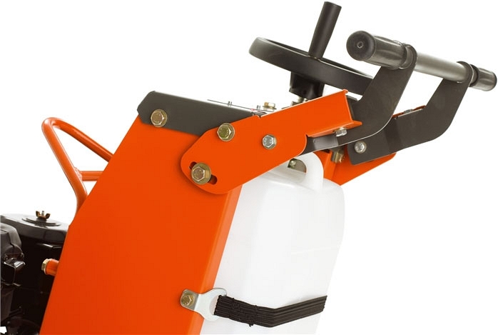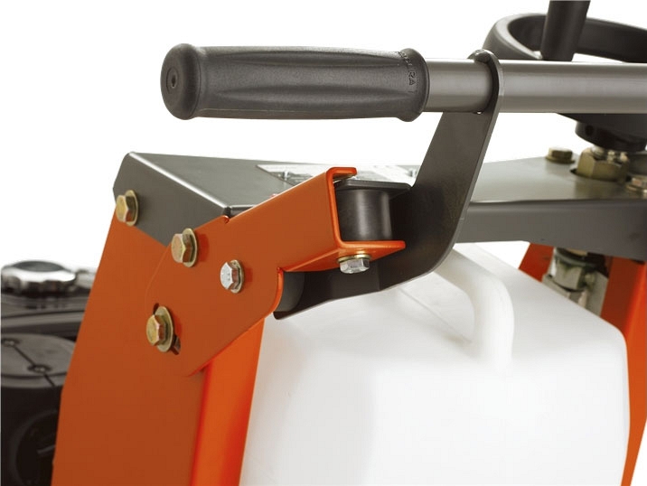 - Большой водяной бак, изготовленный из ударопрочного пластика с быстросоединяемым подключением водяного шланга к верхней части защитного кожуха режущего диска, для отсоединения не требуется никаких инструментов
