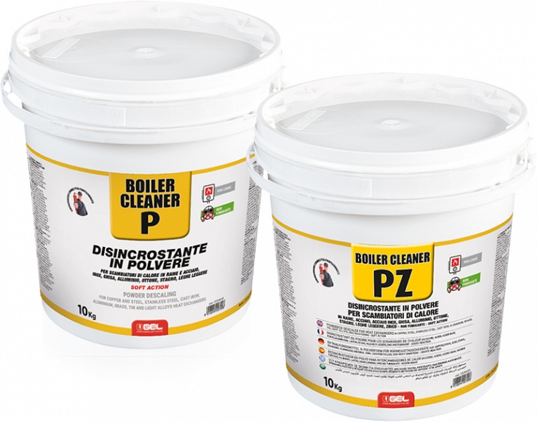 Средство для промывки теплообменников котлов Gel Boiler Cleaner PZ, 10 кг (Гел Бойлер Клинер ПЗ, 10 kg) – неагрессивный, нефумигирующий и некоррозионный (не вызывающий фумиганта и коррозии), недымящий (без дыма), концентрированный порошок для удаления накипи для систем отопления и теплообменников котлов, бойлеров из меди, чугуна, стали, нержавеющей стали, алюминия, латуни, олова, легких сплавов, цинка и оцинкованных поверхностей, для использования с промывочными насосами Boy C и Long Life Superflush.