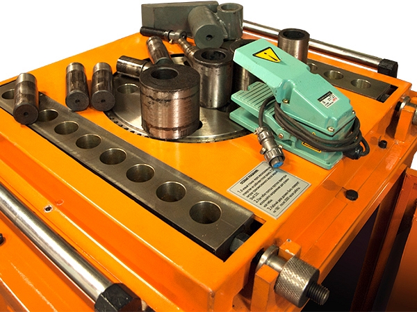 - 3 концевика, настройка каждого угла гибки с помощью штифтов, устанавливаемых на планшайбу, шаг изменения угла 5°