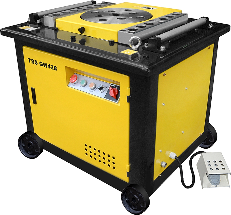Станок для гибки арматуры с концевиком TSS GW 42B (ТСС ГВ 42Б) – электрический гибщик арматуры для холодной гибки арматурной стали, сортового проката на строительных площадках, под навесом, на производствах железобетонных и металлических конструкций (дорожные плиты, блоки, панели перекрытий и т.д.), а также в производственных цехах; востребован непосредственно в строительстве – например, при создании фундаментов зданий.