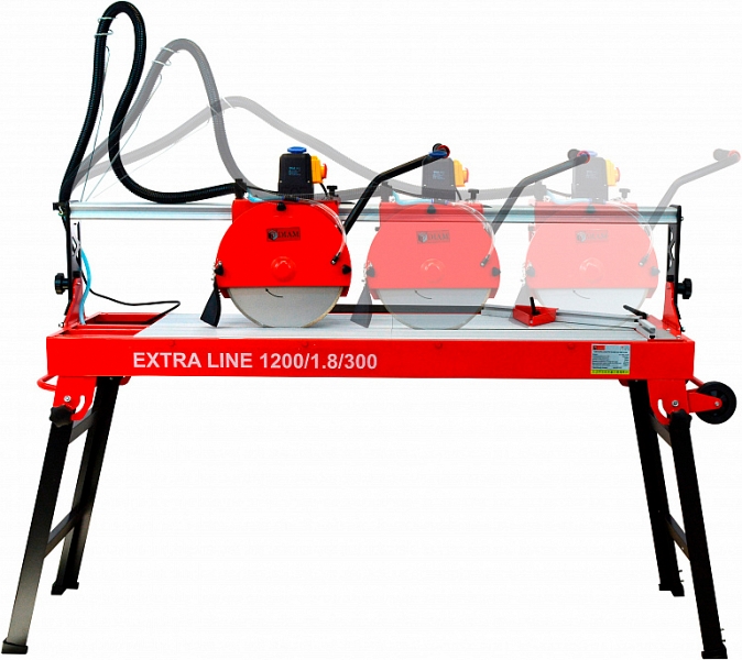 Модель снята с производства! Станок для резки плитки с водой Diam Extra Line EX-1200/1.8/300 (Диам Экстра Лайн ЕХ-1200/1.8/300) предназначен для прямой до 1240 / 1180 мм и диагональной до 840 × 840 мм резки всех видов натуральной и искусственной керамической облицовочной, напольной и тротуарной плитки, керамогранита, толщиной до 70 / 55 мм, под углом от 0° до 45°.