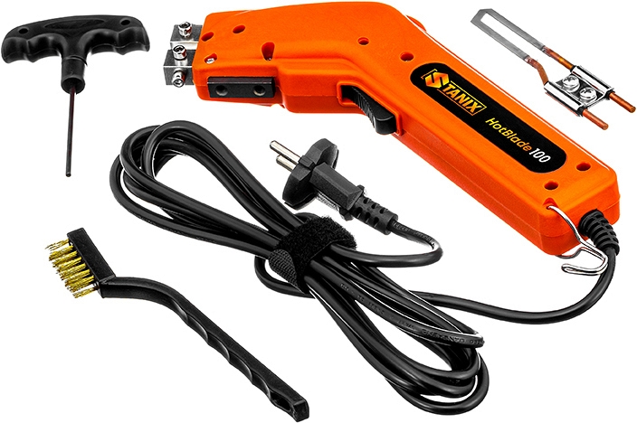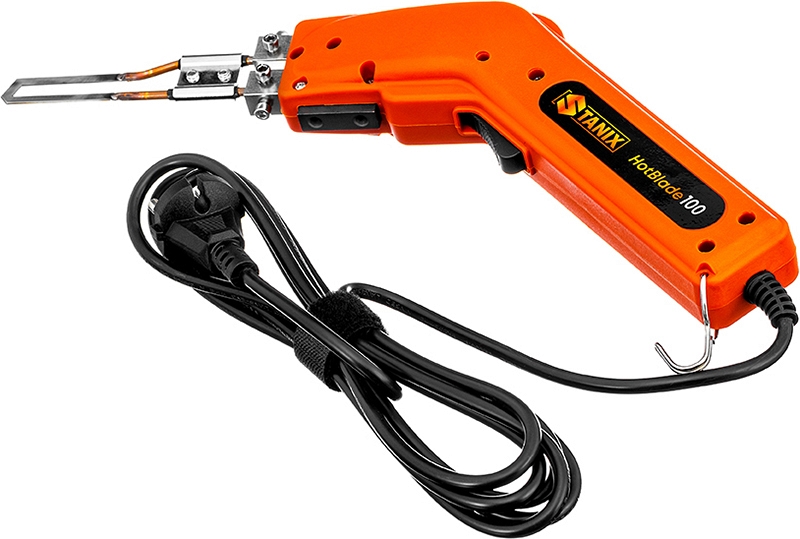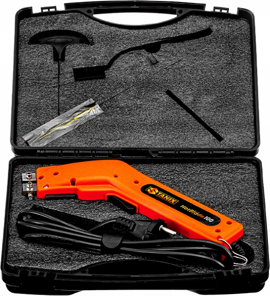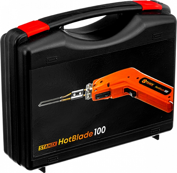Термонож Stanix HotBlade 100 (ХотБлейд 100) – электрический нож с прямым лезвием 50 мм из хромоникелевой стали для беспыльной термической резки элементов из полимеров: полипропилена, ПВХ, полиэтилена и стиродура, полиуретана, пенополистирол (EPS) и экструдированного полистирола (XPS), картона, резины и многого другого в строительных компаниях и курьерских службах, рекламной индустрии, сфере торговли, швейной, автомобильной и электротехнической промышленности, а также в мебельном производстве и архитектурном моделировании, подходит для внутренних и наружных работ, безотходной резки, моделирования, строжки и обрезки теплоизоляционных материалов, идеально подходит для резки изоляционных плит, формирования пазов для электрических или сантехнических установок, с легкостью прорезает пенокартон, пенополистирол, пластиковую упаковку, резину и многие другие материалы, с которыми не справляется обычный нож.