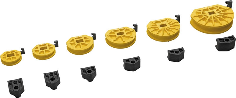 - Гибочные сегменты и упоры скольжения 180°, прочные и стойкие к деформации, из высокопрочного, усиленного стекловолокном полиамида. Оптимальное согласование гибочного сегмента и упора обеспечивает скольжение в соответствии с материалом без образования гофры и заломов. Шкалы угла на каждом сегменте и маркировка на каждом упоре для более точного изгиба. Быстрая смена насадок.