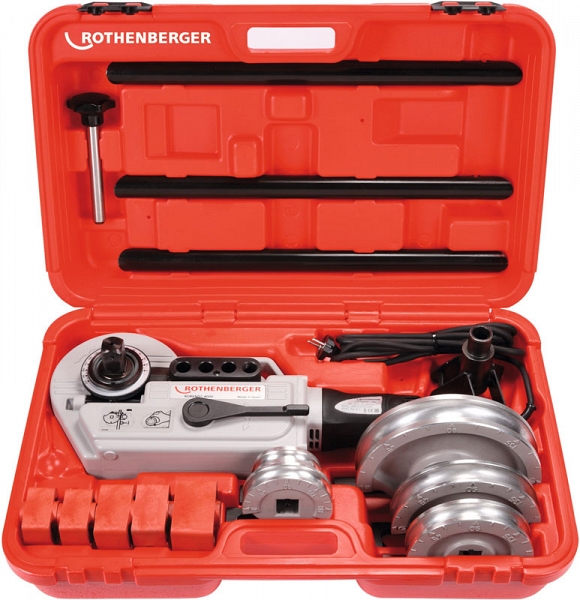 Трубогиб электрический Rothenberger Robend 4000 Set 12-14-16-18-22 мм (Ротенбергер Робенд 4000 Сет 12-14-16-18-22 мм) – мощный, надежный, переносной, электромеханический трубогиб с повышенной производительностью для холодной гибки под углом до 180° труб из твердой, полутвердой и мягкой меди (DIN EN 1057) Ø 12 – 35 мм; медных труб в оболочке, прецизионных мягких стальных труб (DIN 2391 / 2393 / 2394) Ø 12 – 35 мм; черных и оцинкованных стальных труб (DIN 2440 / 2441) Ø 3/8" – 1 3/8"; бесшовных стальных труб (GW 541), металлопластиковых (МПТ) труб Ø 12 – 35 мм (1/2" – 1 3/8"), толщиной стенки до 3,25 мм. Универсальное использование при монтаже систем водоснабжения, отопления, холодильной и климатической техники, прокладке трубопроводов, в промышленности, для серийного производства. Производитель: ROTHENBERGER (РОТЕНБЕРГЕР) – Германия.