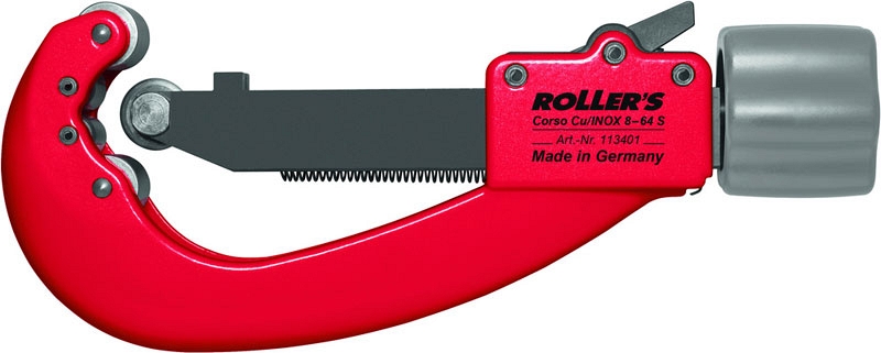 Труборез для медных и нержавеющих труб Roller Corso Cu-Inox 6-64 S (Роллер Корсо Ку-Инокс 6-64 С) на игольчатых подшипниках и с быстрым переставлением – надежный роликовый ручной труборез для резки медных, латунных, алюминиевых, тонкостенных стальных, тонкостенных нержавеющих стальных труб Ø 6 – 64 мм (1/4" – 2 1/2"), толщиной стенки до 4 мм.