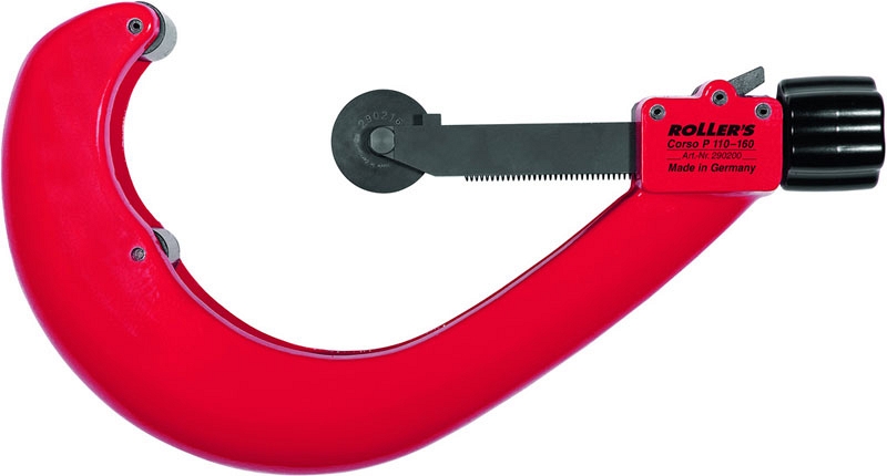 Труборез для пластиковых и металлопластиковых труб Roller Corso P 110-160 (Роллер Корсо П 110-160) с быстрым переставлением – надежный роликовый ручной труборез для резки пластиковых и металлопластиковых труб Ø 110 – 160 мм (2" – 4"), толщиной стенки до 16 мм (с дополнительным отрезным диском – до 19 мм).