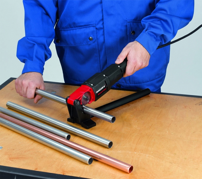 Труборез электрический Roller SmartCut (Роллер СмартКат) – удобный, сверхлегкий, прочный электроинструмент для резки стальных, нержавеющих труб Ø 12 – 28 мм, медных труб Ø 10 – 35 мм, металлопластиковых труб Ø 10 – 40 мм систем пресс-фитинга под прямым углом без стружки и грата.