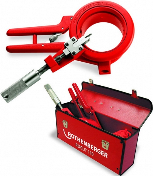 Труборез-фаскосниматель для пластиковых труб Rothenberger Rocut 110 (Ротенбергер Рокат 110) – универсальный инструмент для абсолютно точной перпендикулярной резки и снятия фаски под углом 15° тонкостенных и толстостенных пластмассовых труб из ПВХ, ПЭ, ПП, PE-X, ПБ и ПВДФ, а также звукоизоляционных труб Ø 32 – 110 мм.