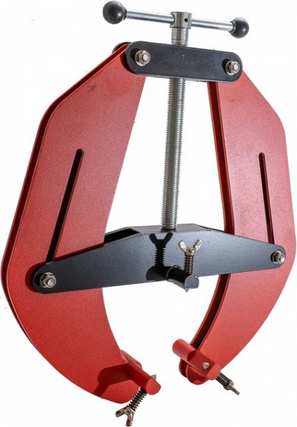 - Конструкция состоит из стальной рамы с 2-мя ножками с регулировочными винтами и верхнего прижима с затяжным винтом, которые регулируют размер охватываемых труб с лапкой и винтом центровки
