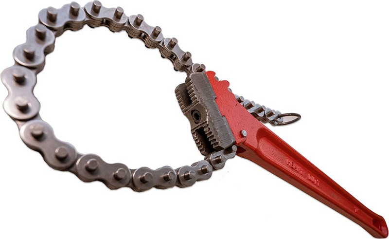 - Прочная цепь из специальной стали c улучшенной термообработкой: пригоняется под трубы всех указанных диаметров; обхватывает трубу по всему радиусу, за счет этого усилие распределяется равномерно по поверхности трубы