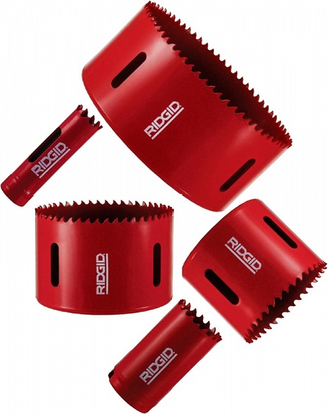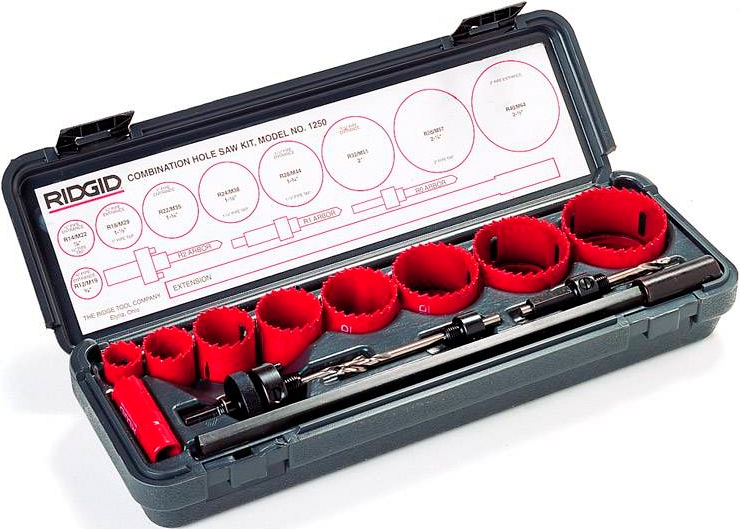 Универсальный набор биметаллических коронок общего назначения Ridgid 1250 (Риджид 1250) предназначен для сверления отверстий в металлических (стальных, чугунных, латунных, алюминиевых) трубах и листовой стали, дереве (досках, паркете, фанере, вагонке), пластике с использованием ручных дрелей и сверлильных станков.
