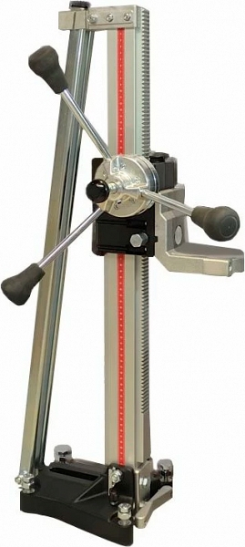 - Наклонная колонна, с сантиметровой линейкой сбоку для отслеживания глубины засверливания, крепится на шарнирах к опорной плите и имеет дополнительный упор для большей жесткости, возможность алмазного сверления отверстий под углом от 0° до 45°