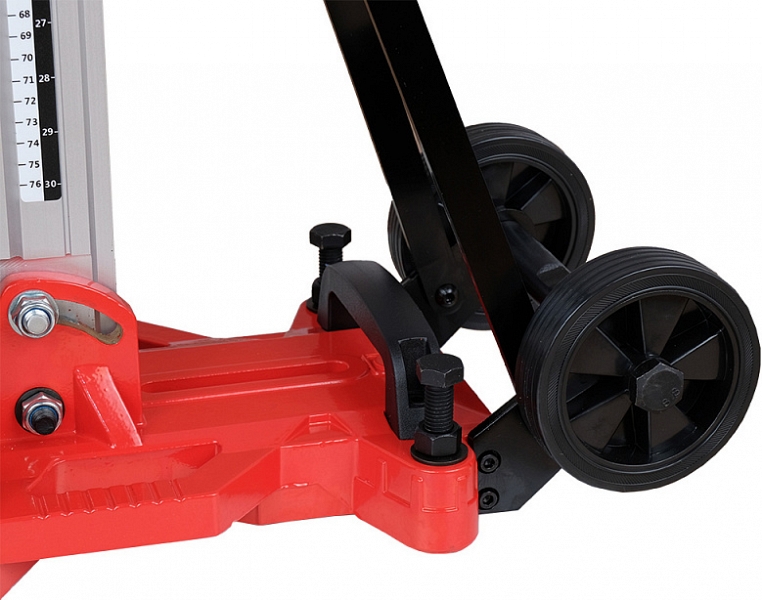 - Алюминиевая станина (стойка) с основанием и электродвигатель, закрепленный на рабочей каретке с двухскоростным редуктором, которая перемещается по стойке с помощью стальной зубчатой рейки