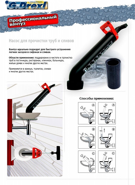 Вантуз для унитаза G.Drexl (Джи.Дрексл) – вантуз профессиональный сантехнический пневматический воздушный вакуумный для прочистки унитаза, туалета, раковины, канализации; устранения засоров в сифонах, трубах и сливах; обслуживания трубопроводов медицинских учреждений, ресторанов, гостиничных комплексов, жилых зданий и других объектов.