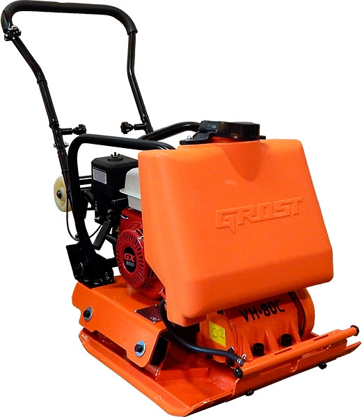 Виброплита бензиновая Grost VH-80C (Грост ВХ-80Ц) – универсальная прямоходная вибрационная плита поступательного движения с бензиновым двигателем GX200 S type повышенной мощности для широкого спектра работ для уплотнения дорожек на даче, мелких работ на дачном участке, ландшафтного дизайна; укладки тротуарной плитки (необходимо дополнительно приобрести полиуретановый демпфирующий коврик, который не входит в стандартную комплектацию); уплотнения асфальта, ямочного ремонта; ремонта городских дорог, строительства и ремонта пешеходных дорожек на территориях, прилегающих к зданиям.