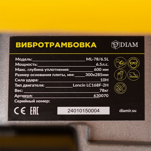 Цена и технические характеристики вибротрамбовки бензиновой для уплотнения грунта Diam ML-78/6.5L: