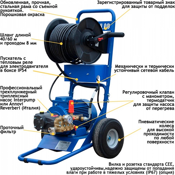 - Профессиональный надежный насос высокого давления с керамическими плунжерами Interpump (Италия) и электродвигатель с защитой от перегрузки повышают эффективность очистки и надежность эксплуатации